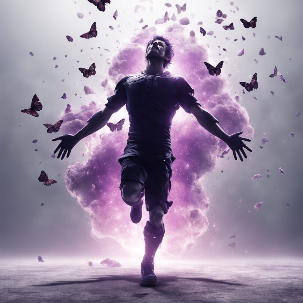 A hyperrealistic concept art piece showing a person's chest cracking open, releasing a radiant explosion of purple light, nebulae, and butterflies, symbolizing release and transcendence.