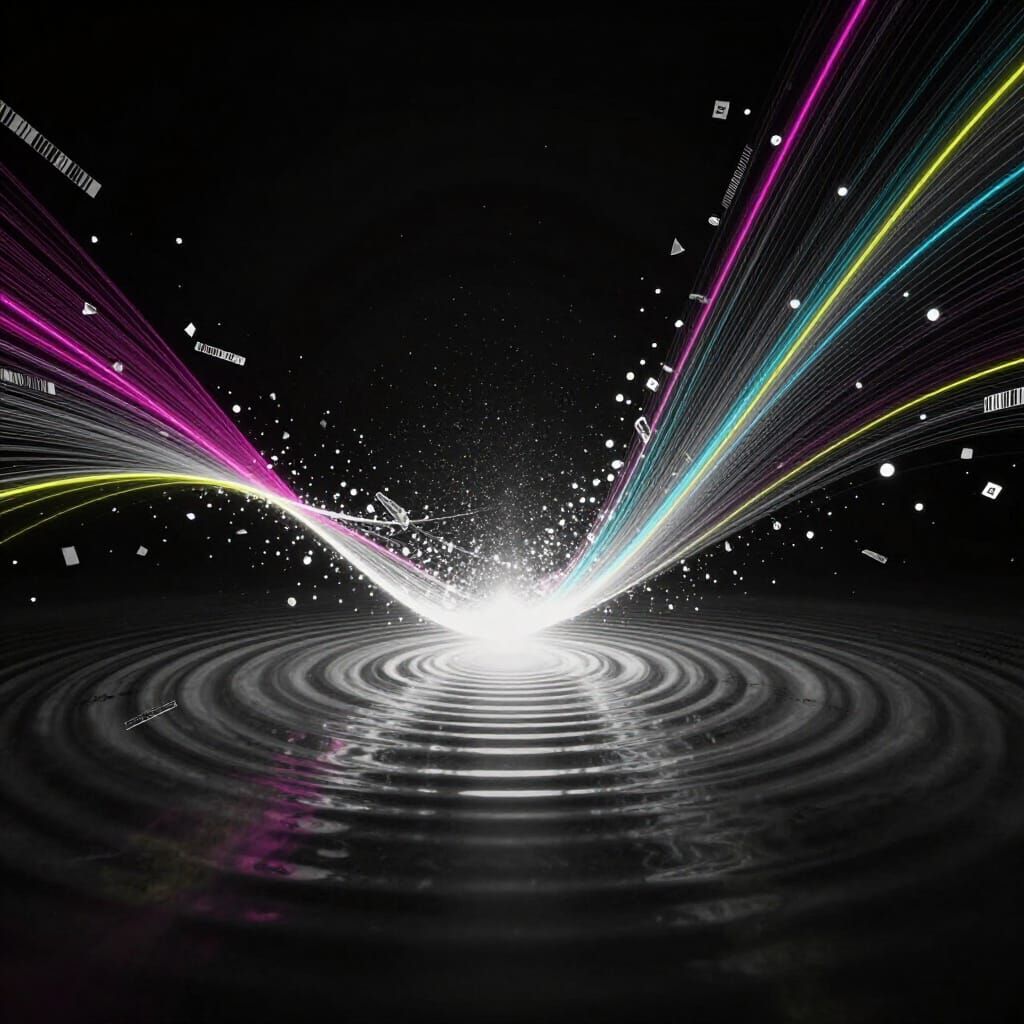 This image depicts a vast, glowing field of light on a dark surface, with intricate ripples and orbiting geometric shards. Radical neon streaks and floating fragments create a surreal, cinematic, mixed-media aesthetic inspired by mathematical concepts.
