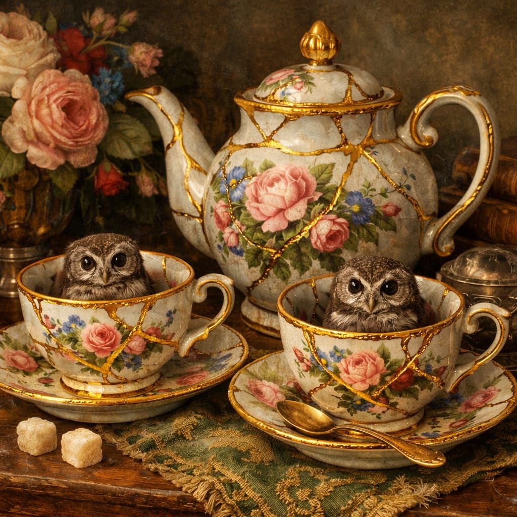 This image showcases delicate Renaissance tea cups and a teapot adorned with floral designs. Tiny owls rest within the cups, which are artfully repaired with Japanese Kintsugi.