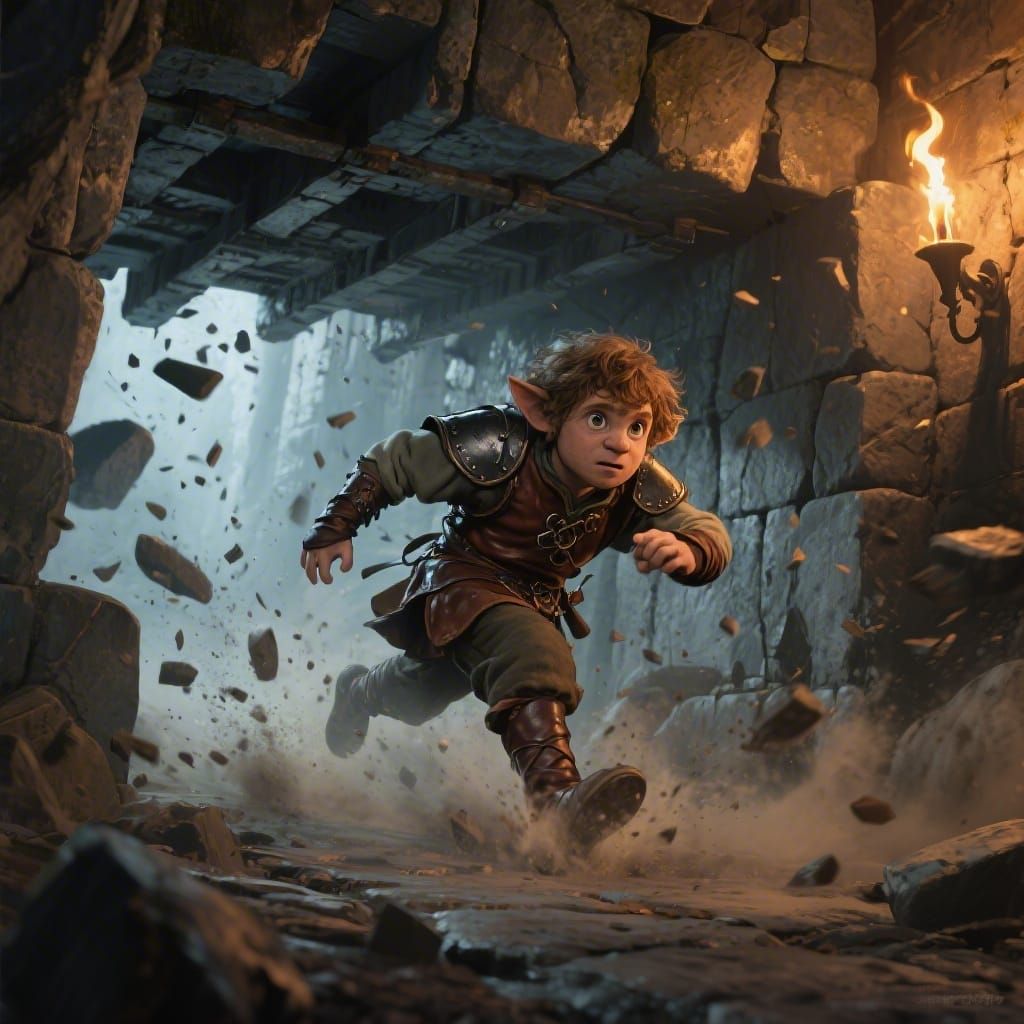 This concept art shows a determined hobbit adventurer in leather armor narrowly escaping a crushing stone trap in ancient ruins. Dramatic torchlight creates sharp shadows, conveying urgency and cinematic action.