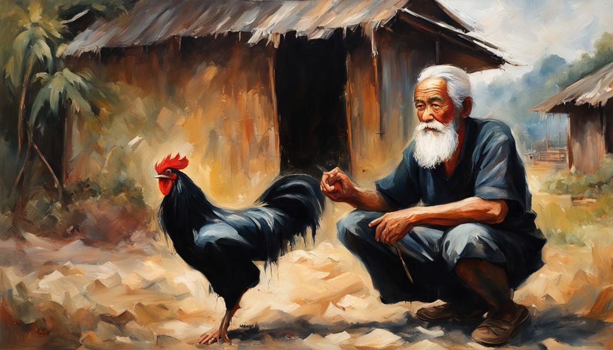 This image shows an elderly Indonesian man with a white beard, gently stroking a rooster. The scene is set against a rustic bamboo house in a traditional village, rendered with heavy impasto brushstrokes for a textured, vintage oil on canvas feel.
