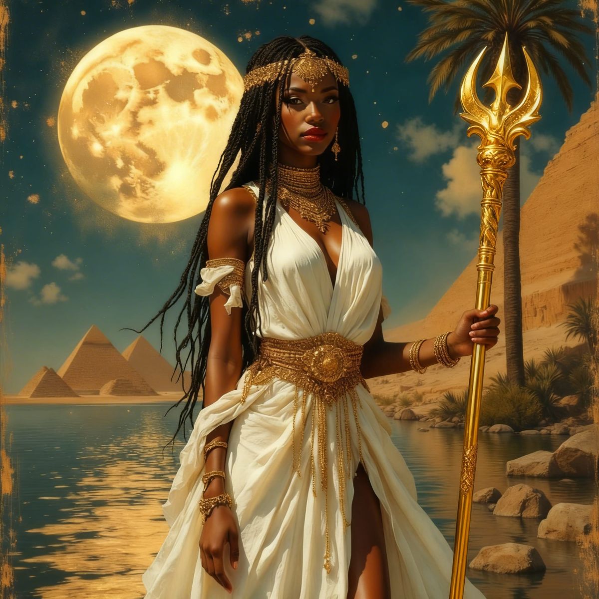 This image shows a hyperrealistic portrayal of an elegant African goddess with braided hair and royal attire, stepping out authoritatively against a backdrop of pyramids and a full moon, depicted in a divine oil painting style with dramatic lighting.