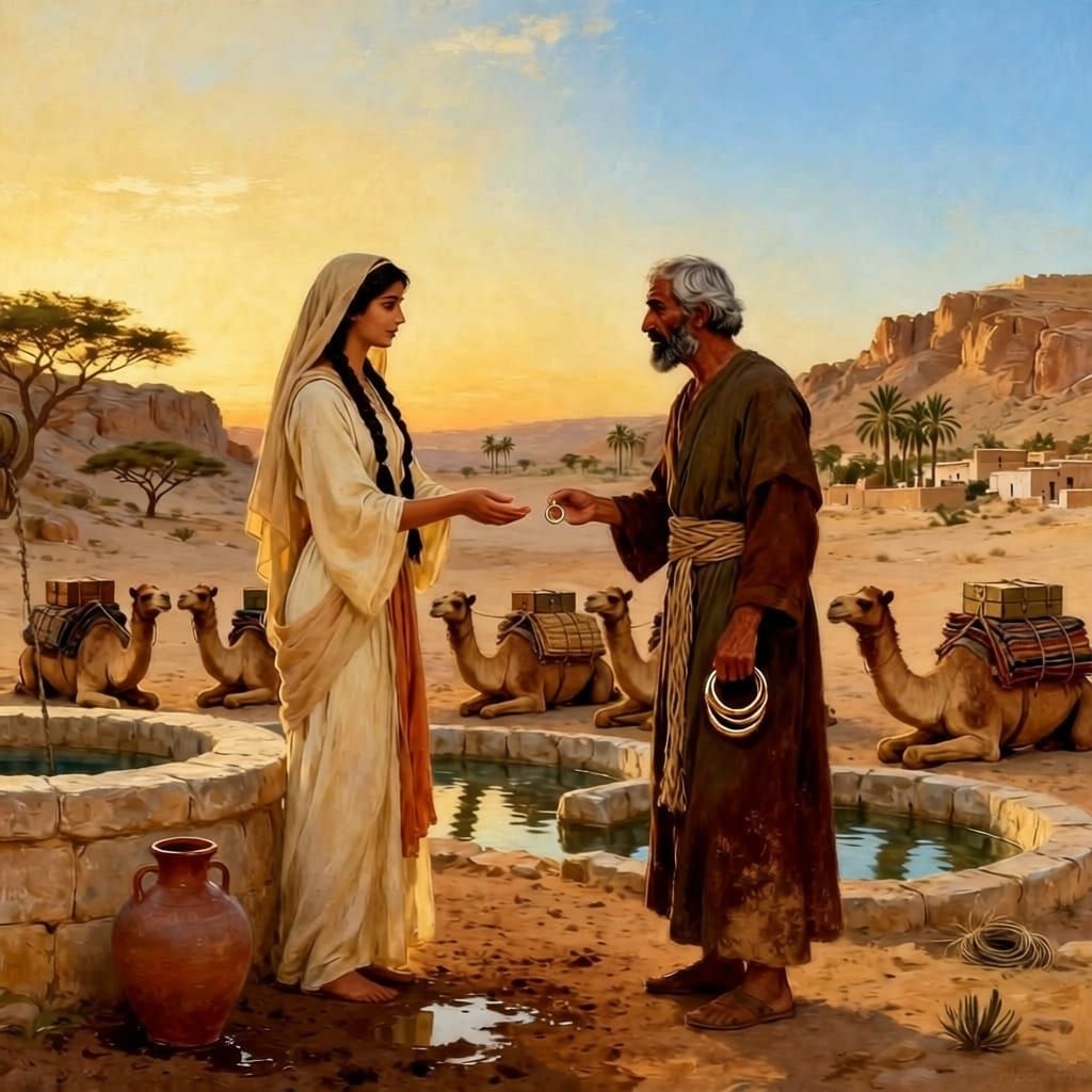 Abraham's servant went to Mesopotamia... Rebekah came out... and she said, Drink, my lord... she drew water for all his camels... The servant gave her a golden earring... bracelets... Rebekah said, I will go... Isaac came from the way... and he took Rebekah... and she became his wife.