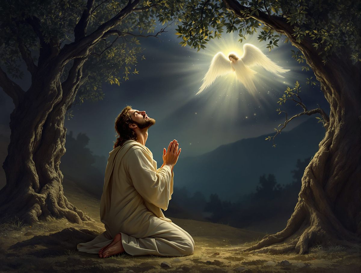 This image depicts Jesus kneeling in prayer in the Garden of Gethsemane, illuminated by moonlight. An angel hovers nearby, offering comfort. The scene captures deep sorrow and supplication, rendered with spiritual light and dramatic contrast.