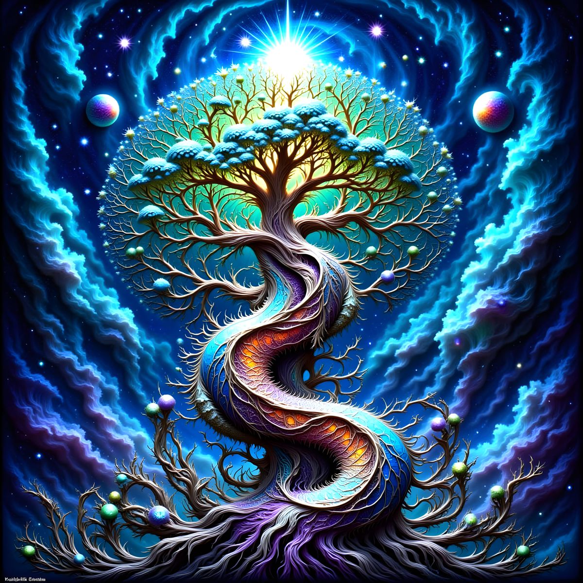A majestic figure eight ouroboros with iridescent fractal scales encircles a celestial tree with filigree leaves against a swirling nebula. Art Nouveau and cosmic art style.