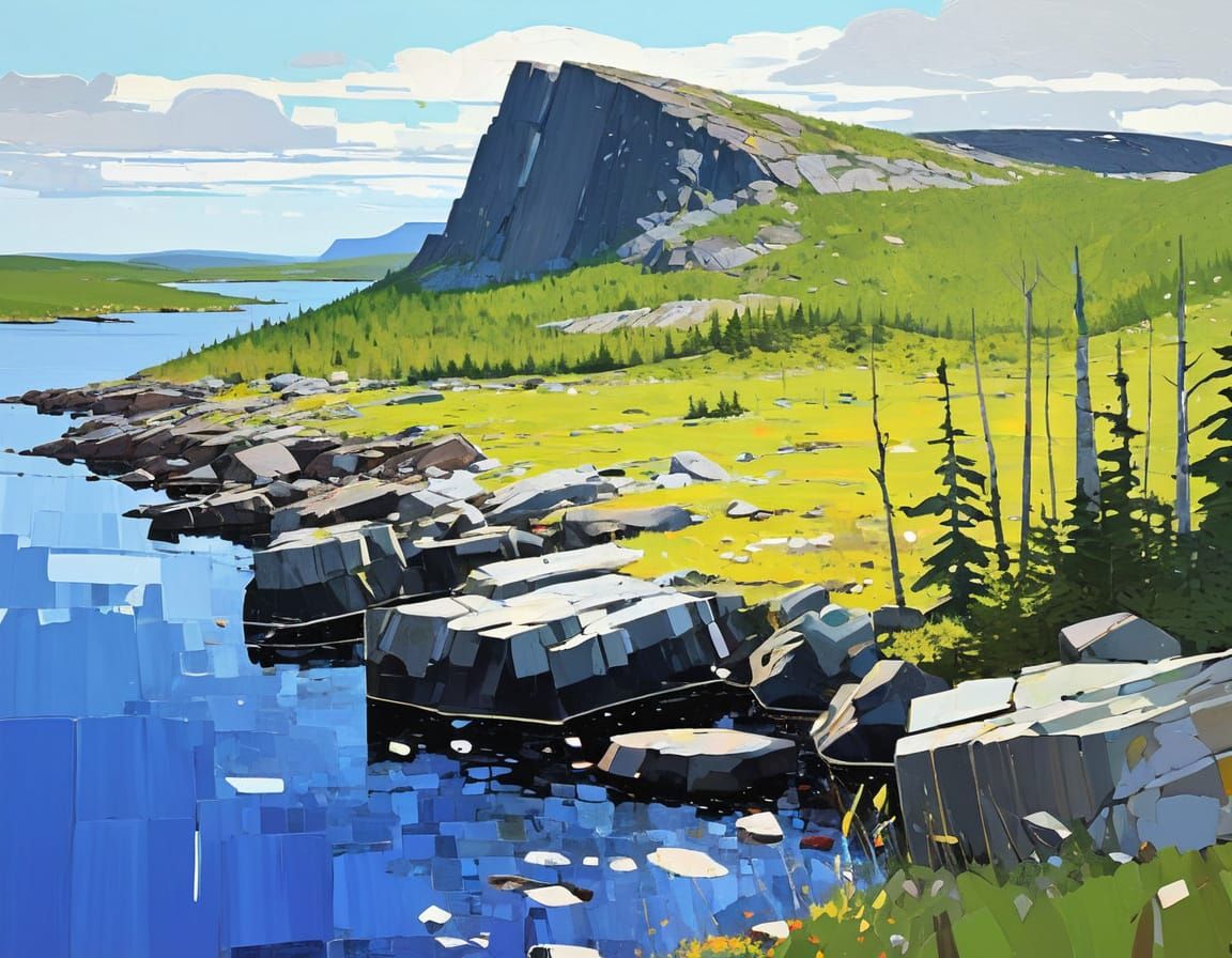 This image depicts a vibrant landscape of Gross National Park in Newfoundland. The artwork is characterized by bold colors and expressive brushwork, reminiscent of mid-20th century abstract painting.