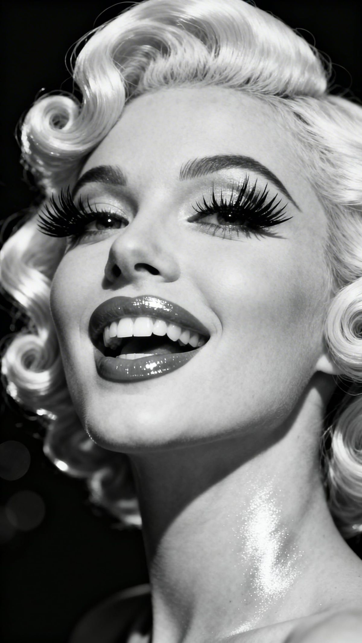 This image captures an ethereal platinum blonde woman in a dramatic black and white portrait. Features include sculpted vintage waves, ecstatic bliss, and striking chiaroscuro lighting for pure glamour.