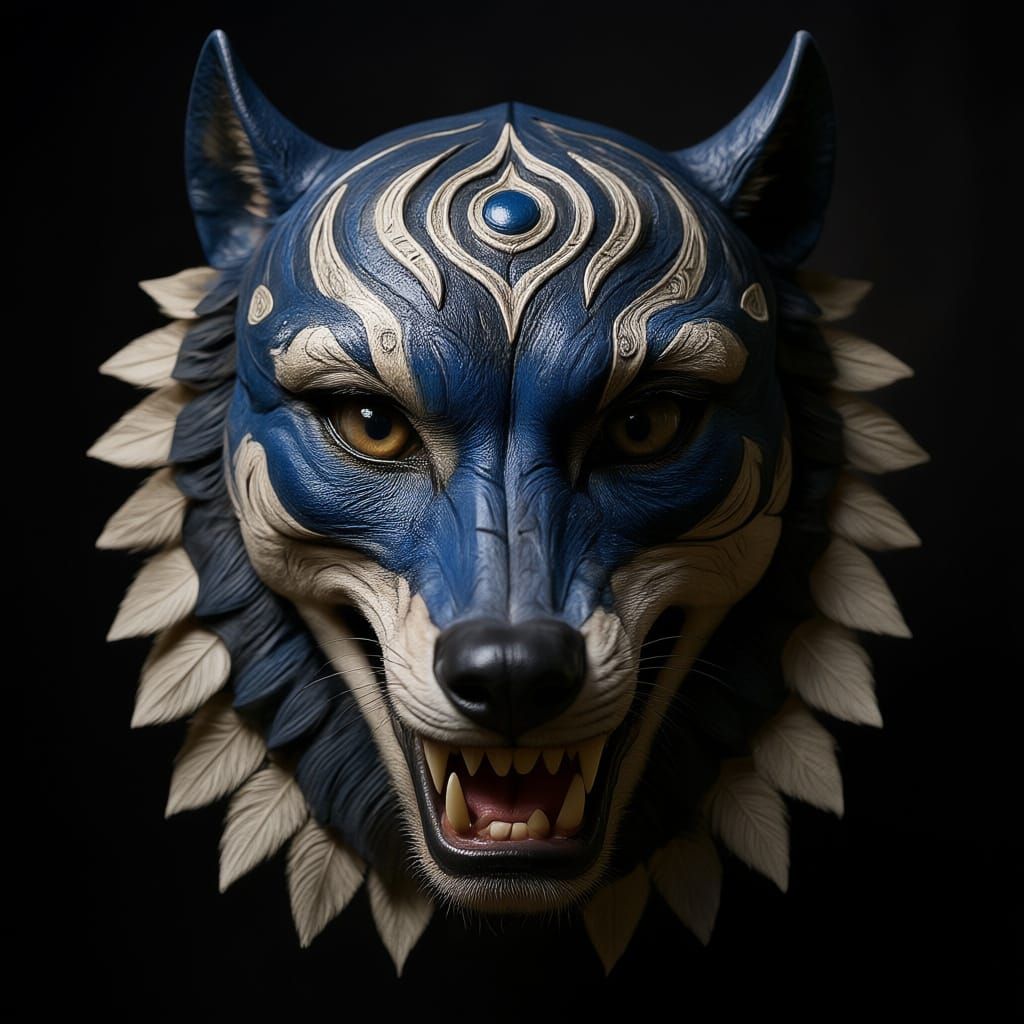 This image features a striking tribal wolf mask with dark blue, grey, and white colors, rendered in the dramatic style of an Oni mask against a stark black background.