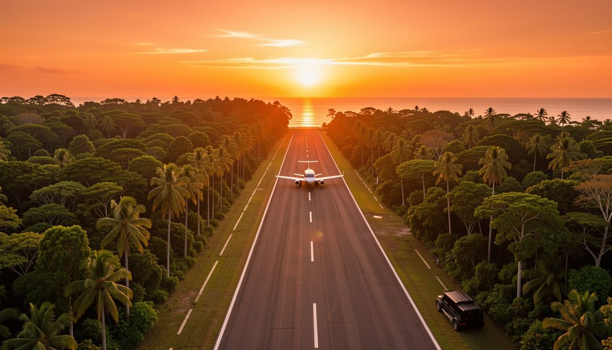 A striking aerial view of a lush tropical island featuring dense trees, tall palms, and a long runway. A luxury jet and a black G63 are visible during a vibrant, cinematic sunset.