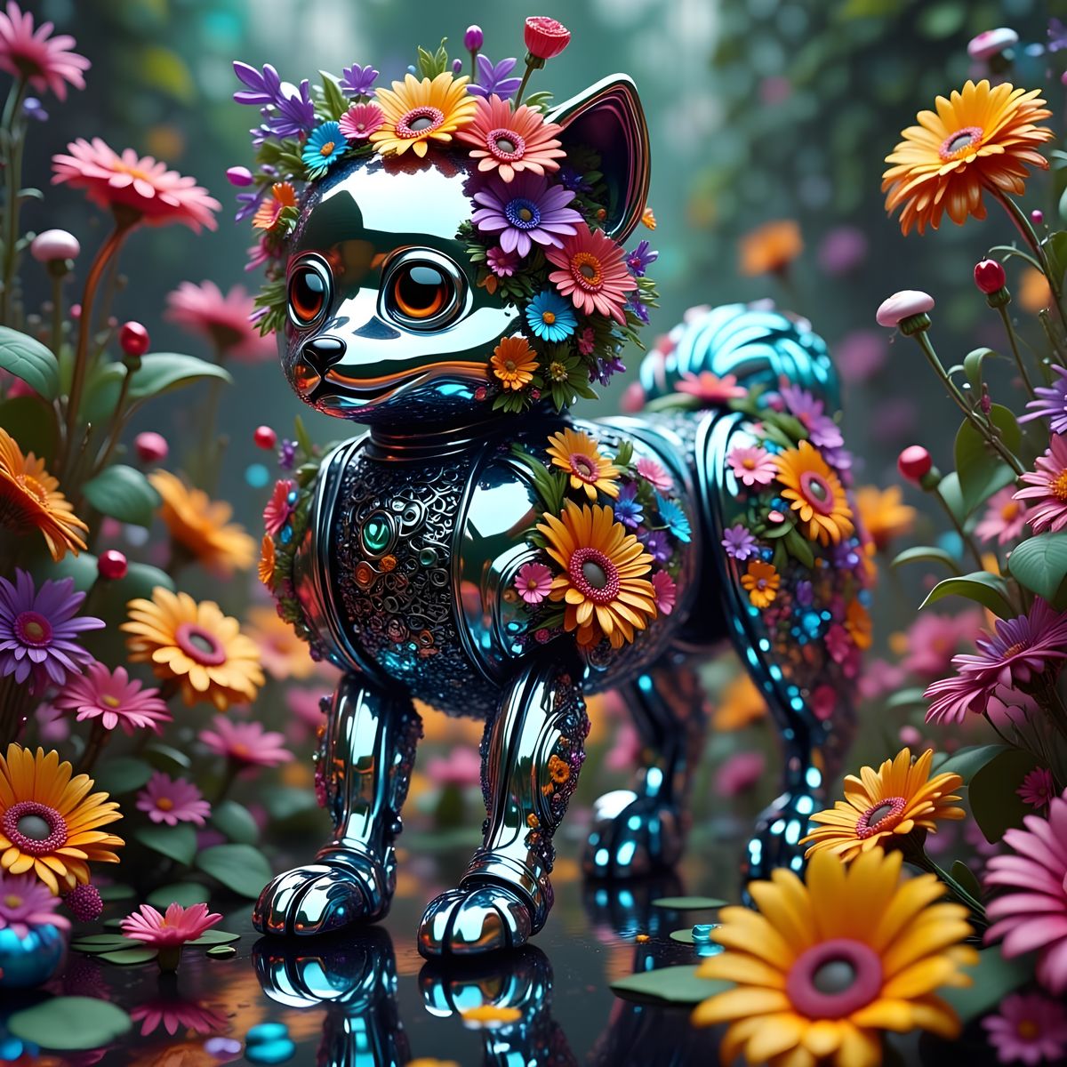This image shows a robot Pomeranian dog adorned with flowers. The chrome surface has an oil slick effect, creating a unique visual.