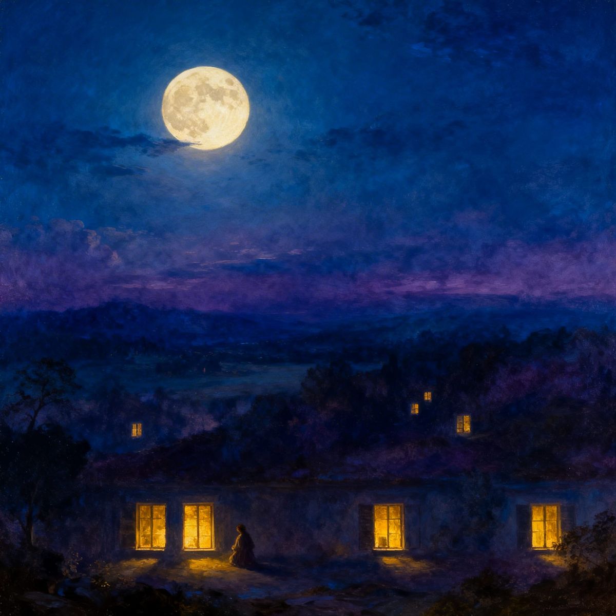 This image shows a luminous full moon in a twilight sky, illuminating a tranquil landscape. Soft light from windows suggests peaceful habitation, evoking a sense of calm. Rendered in a dreamlike, painterly style.