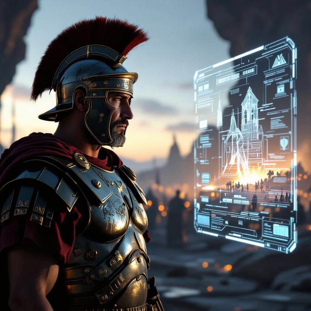 This image shows a stoic Roman centurion viewing a holographic futuristic battlefield. Rendered in a hyperrealistic digital painting style with cinematic lighting and ultra-high detail.