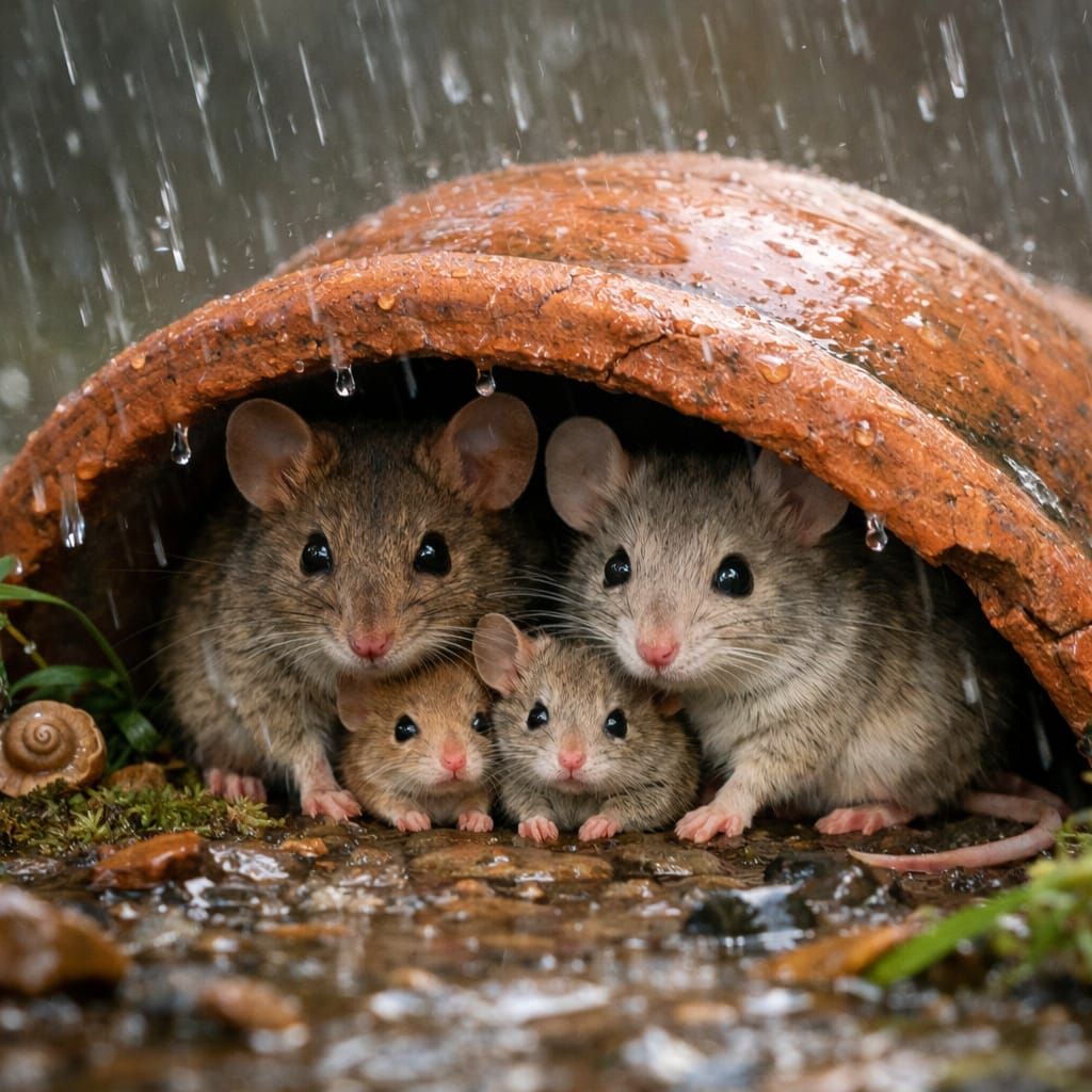 A charming image depicting a family of mice finding shelter from a rainstorm beneath a terracotta pot. The scene captures a moment of cozy refuge amidst the weather.