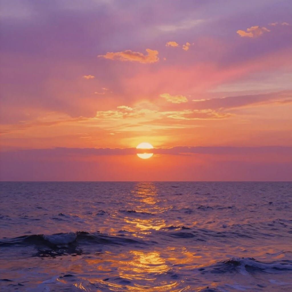 This image shows a breathtaking ocean sunset with fiery oranges, deep purples, and soft pinks. Golden light reflects on gentle waves, evoking a tranquil vista with dramatic light and atmospheric depth.