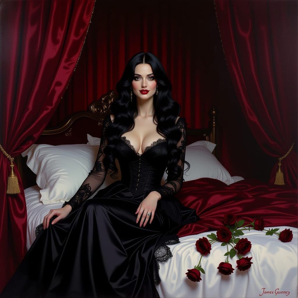 This oil painting captures a mysterious woman with long black hair and alabaster skin in a rich, half-dark bedroom. She wears a gothic dress and smiles enigmatically from a bed adorned with black roses, rendered in an impressionistic style.