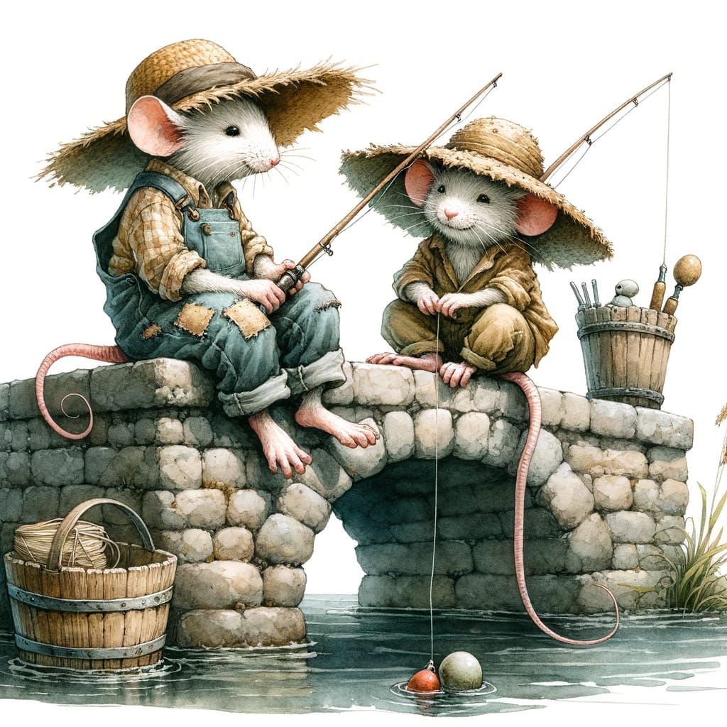 This image shows two mice in rustic farmer clothes fishing from an old stone bridge. Vintage bobbers float on the water, captured in a wet watercolor technique.