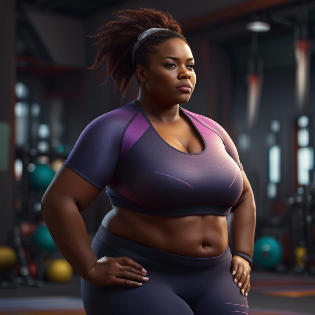 This image shows a plus-size African American woman in workout clothes. The artwork is a detailed matte painting featuring deep colors and intricate details, rendered in 8k resolution.