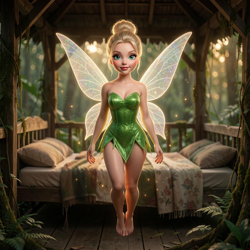 A cinematic, full-body portrait of a photorealistic fairy with blonde hair and large eyes, hovering in a detailed treehouse. Soft evening light and magical dust create a bokeh effect.