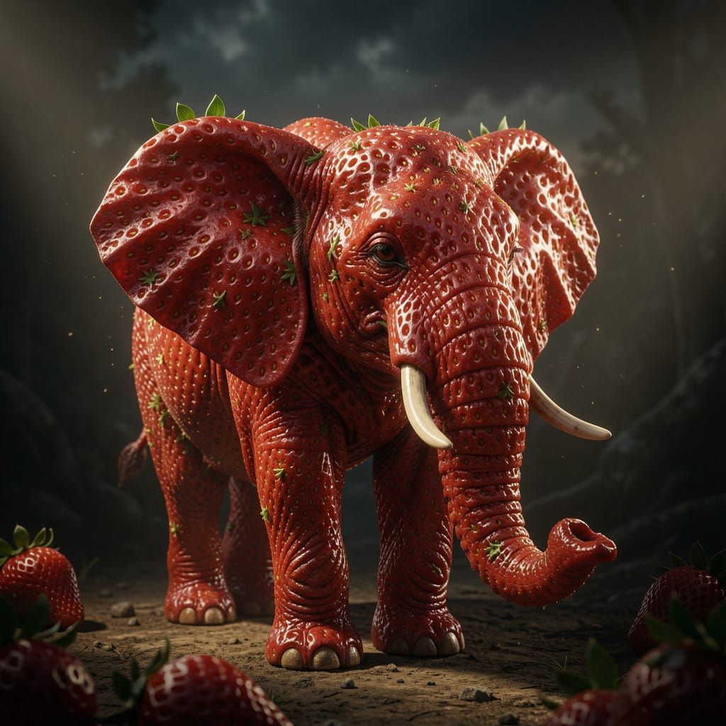 This image shows a hyperrealistic elephant meticulously crafted from strawberries, set against a dark, moody background with volumetric lighting. The detailed rendering creates a striking visual.