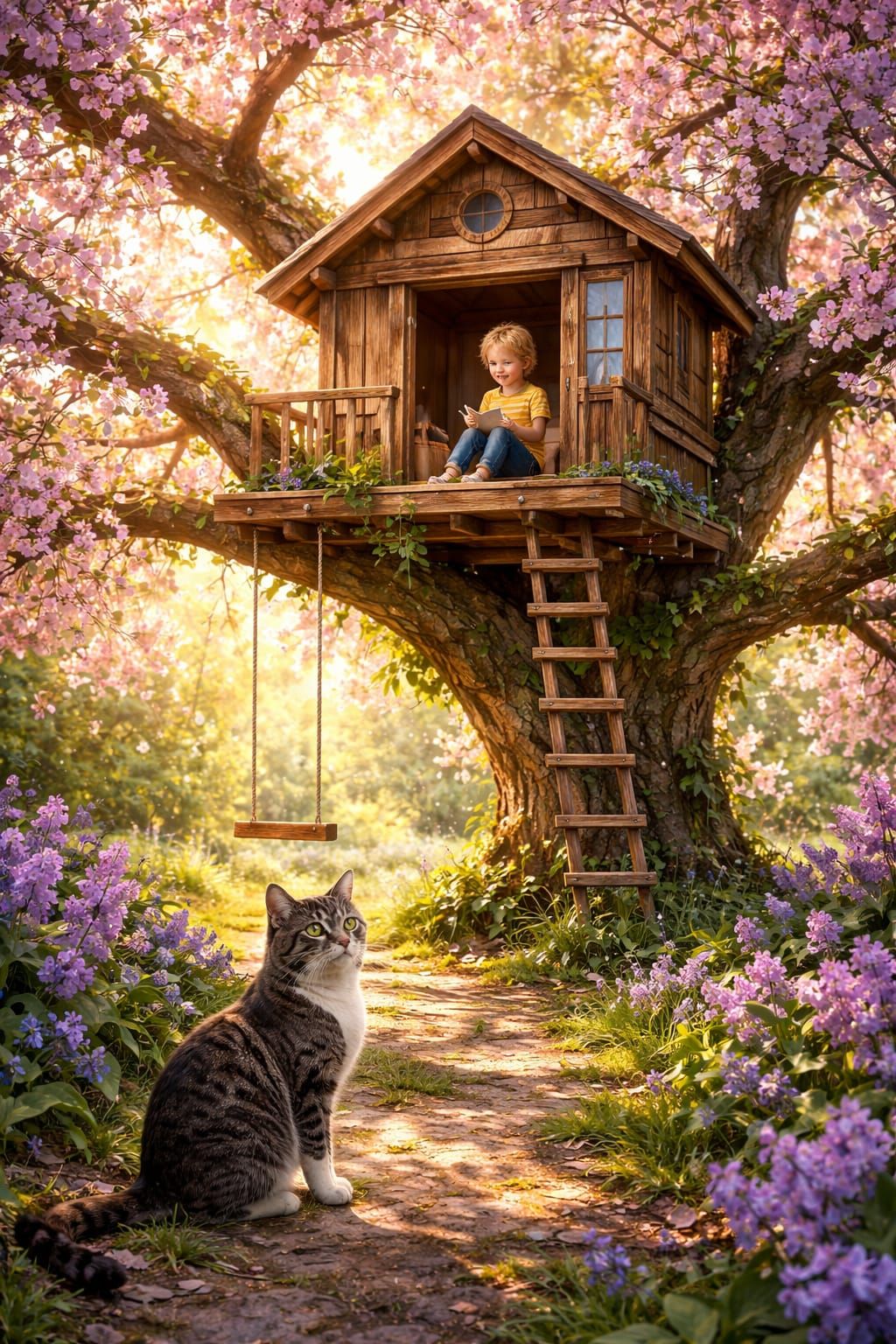 This image showcases a hyper-detailed, realistic depiction of a charming wooden treehouse nestled in a blooming spring tree. A child sits within the treehouse, while a tabby cat watches from below under bright sunshine.