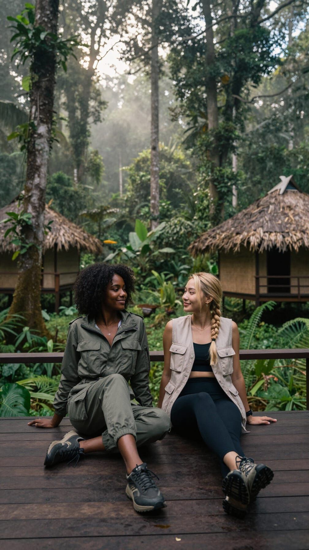 This photorealistic image shows two serene women enjoying the early morning mist and sunlight at a Borneo rainforest lodge. Dense jungle and towering trees surround them.