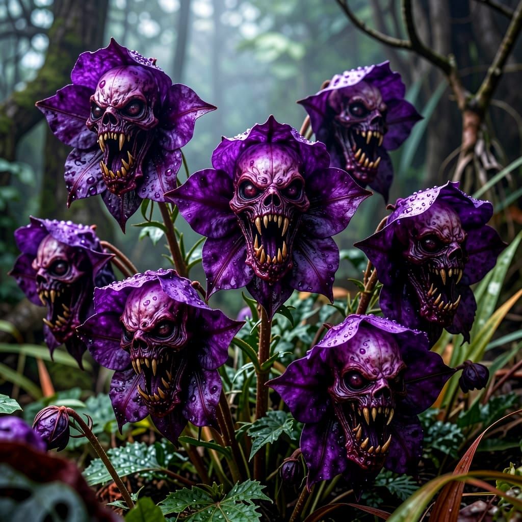 This image depicts frightening flowers with purple blossoms shaped like toothy animal faces, meticulously rendered with intricate details in a natural setting.