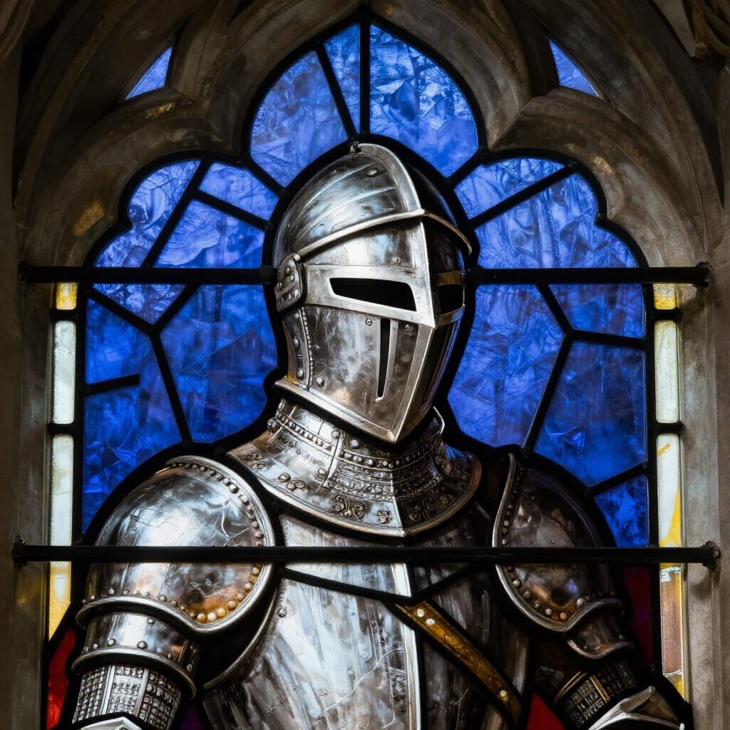 This image showcases a knight's helmet within a Gothic cathedral window. Rendered with deep jewel tones and simulated Grisaille paint, it features directional light highlights.