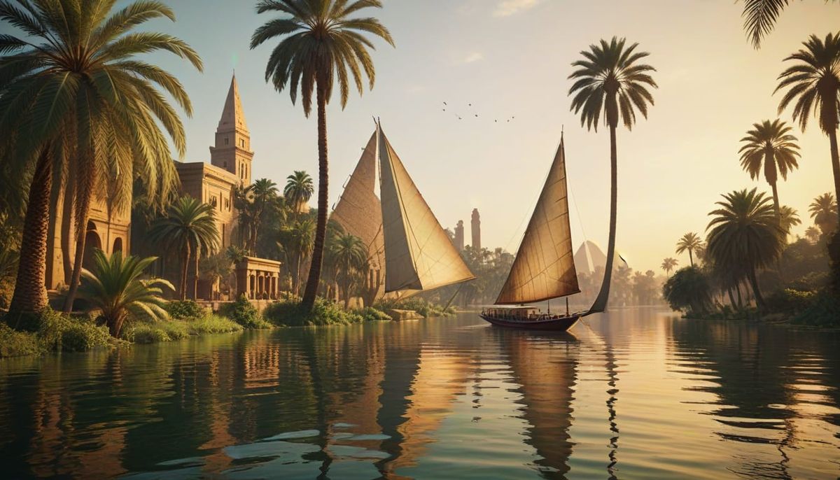 This hyper-realistic digital art captures a felucca sailing down the Nile River at sunset. Lush greenery, ancient temples, and soft warm light create a serene, vibrant scene.