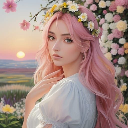 A romantic image of a blonde woman silhouetted against the sunrise. She sits on a flower swing, with flowers in her hair, rendered as an impressionistic oil painting with pastel colors.