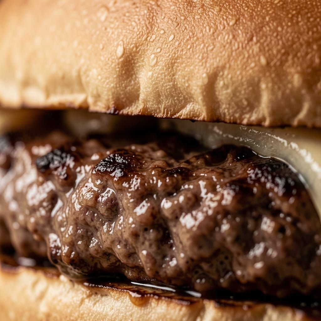 This image showcases extreme macro food photography of a juicy hamburger, highlighting intricate textures and realistic gloss with cinematic lighting and a shallow depth of field.