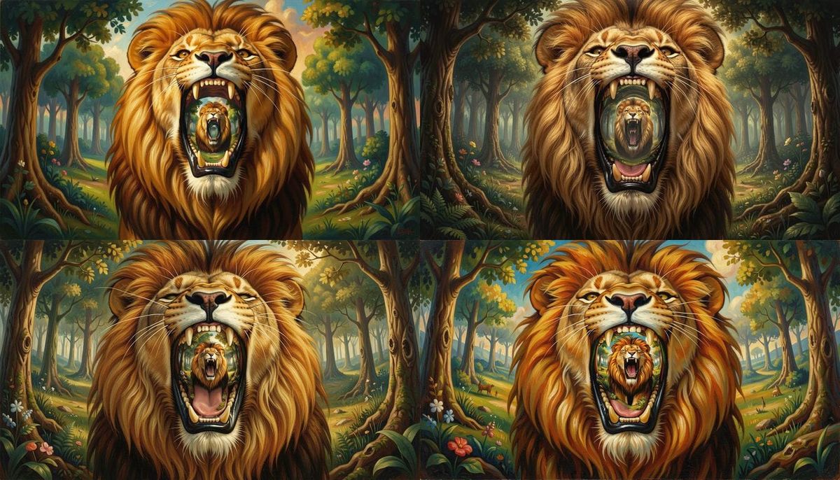 This surreal image features a majestic lion roaring in a serene forest. Inside its open mouth, the forest scene is mirrored, creating an infinite, recursive visual effect.