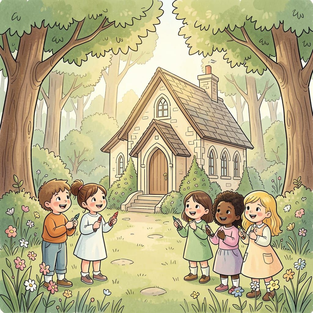 This illustrative coloring page features diverse children around a charming forest chapel, ready to color. Inspired by children's book art, it has bold outlines and soft, natural colors.
