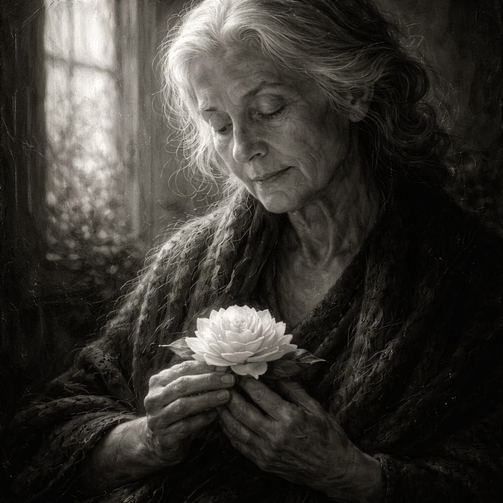 This evocative oil painting features an elderly woman in peaceful repose, cradling a glowing camellia. Rendered in a monochromatic palette with soft chiaroscuro lighting and thick impasto, it captures quiet resilience and profound emotional depth.