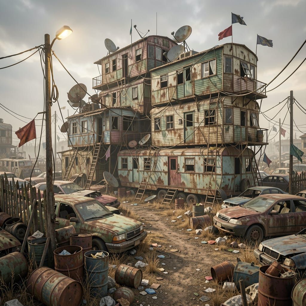 A hyperrealistic, cinematic scene of a multi-level, stacked trailer settlement in a post-apocalyptic, junkyard environment. Features weathered textures, scattered debris, and intricate details.