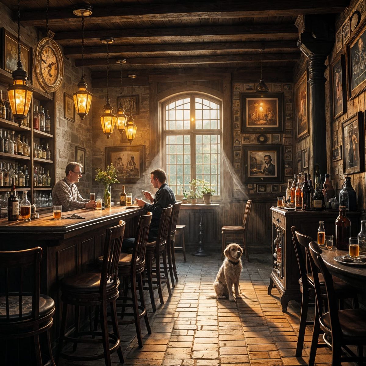 A classic, centuries-old "bruine kroeg" in Belgium during the quiet hour between lunch and dinner. Soft, dusty afternoon