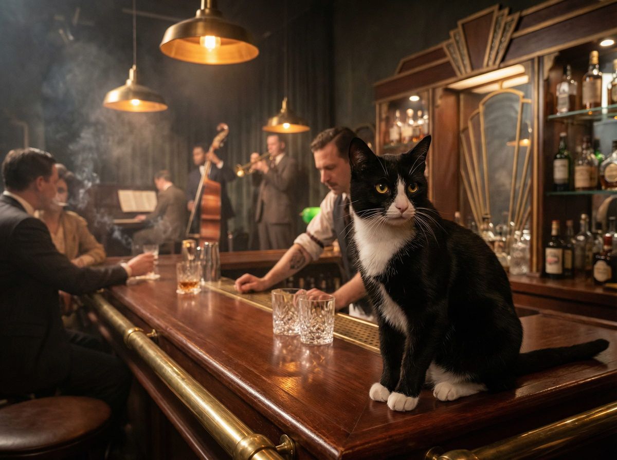 This image shows a sleek tuxedo cat sitting on a bar in a moody, dimly lit 1920s speakeasy. Features include smoky jazz ambiance, Art Deco details, and photorealistic film noir lighting.