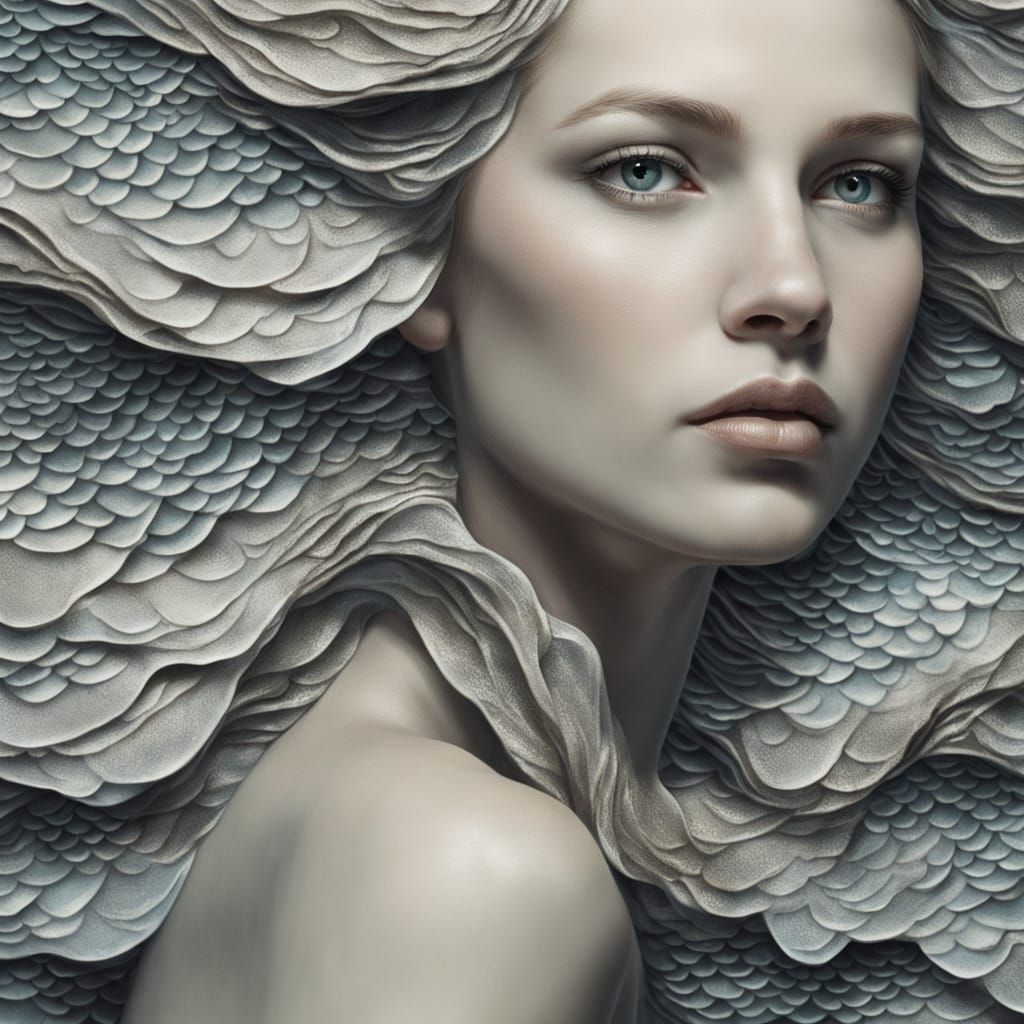 This oil painting captures a beautiful woman with skin artfully blended with fish scales, evoking a mystical mermaid. Soft, dramatic lighting highlights intricate details.