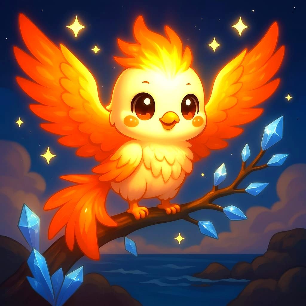 A digital painting of a phoenix with glowing embers on a crystal branch, overlooking a cosmic ocean. Features ethereal fantasy art with surreal cosmic elements.
