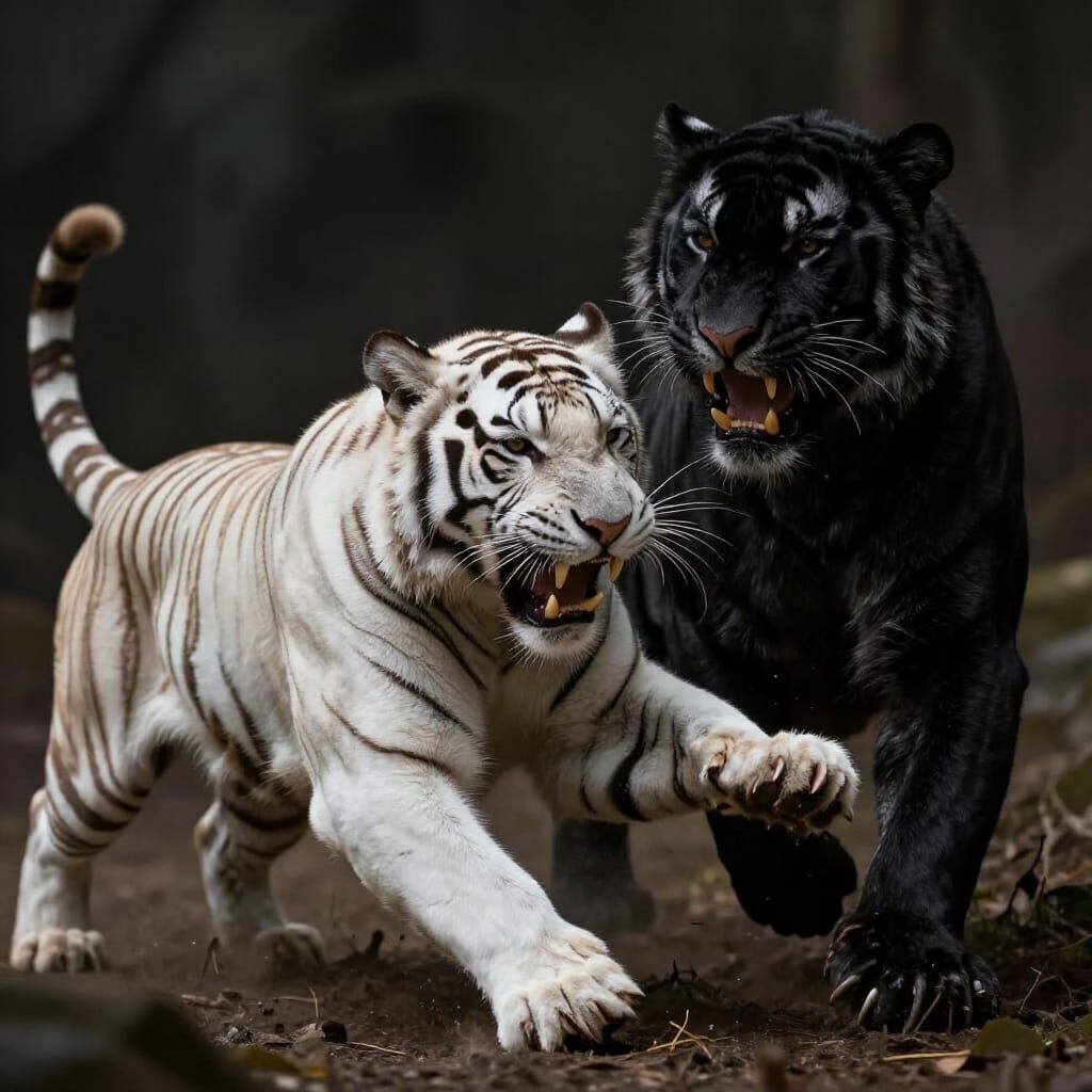 A striking image of a white tiger lunging at a black tiger, capturing intense motion and ferocity. Rendered with dramatic lighting and sharp detail, reminiscent of Baroque painting techniques.
