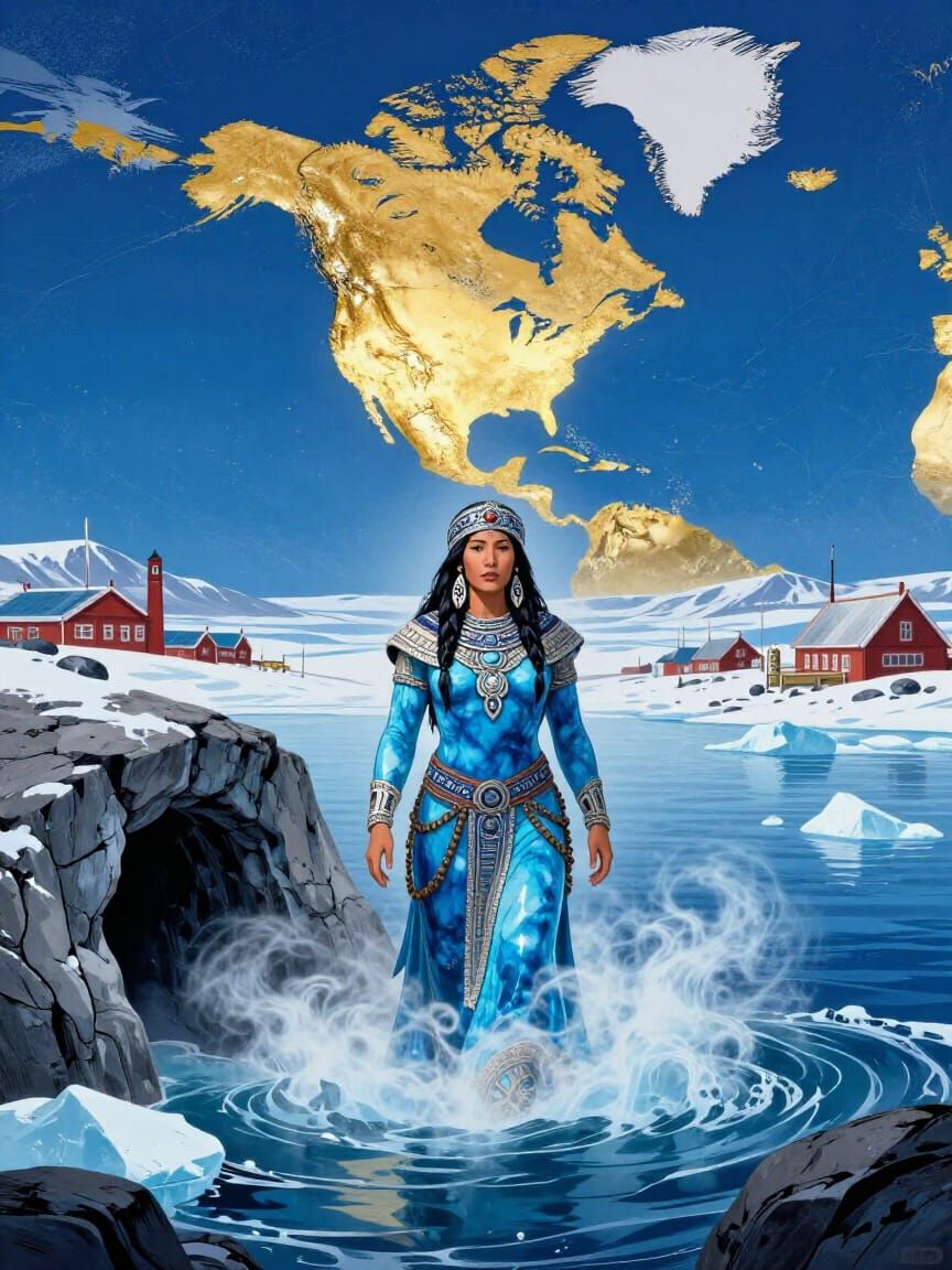 North America: Bold Horizons - Sedna, Seven Continents, Seven Vision, in the background North_America is highlighted with a golden glow, Pop Art Silk Screen Printing, hyperdetailed glossy texture, Powerful image of an Inuit Goddess Sedna standing by a cave on the edge of the icy ocean emerging from ...