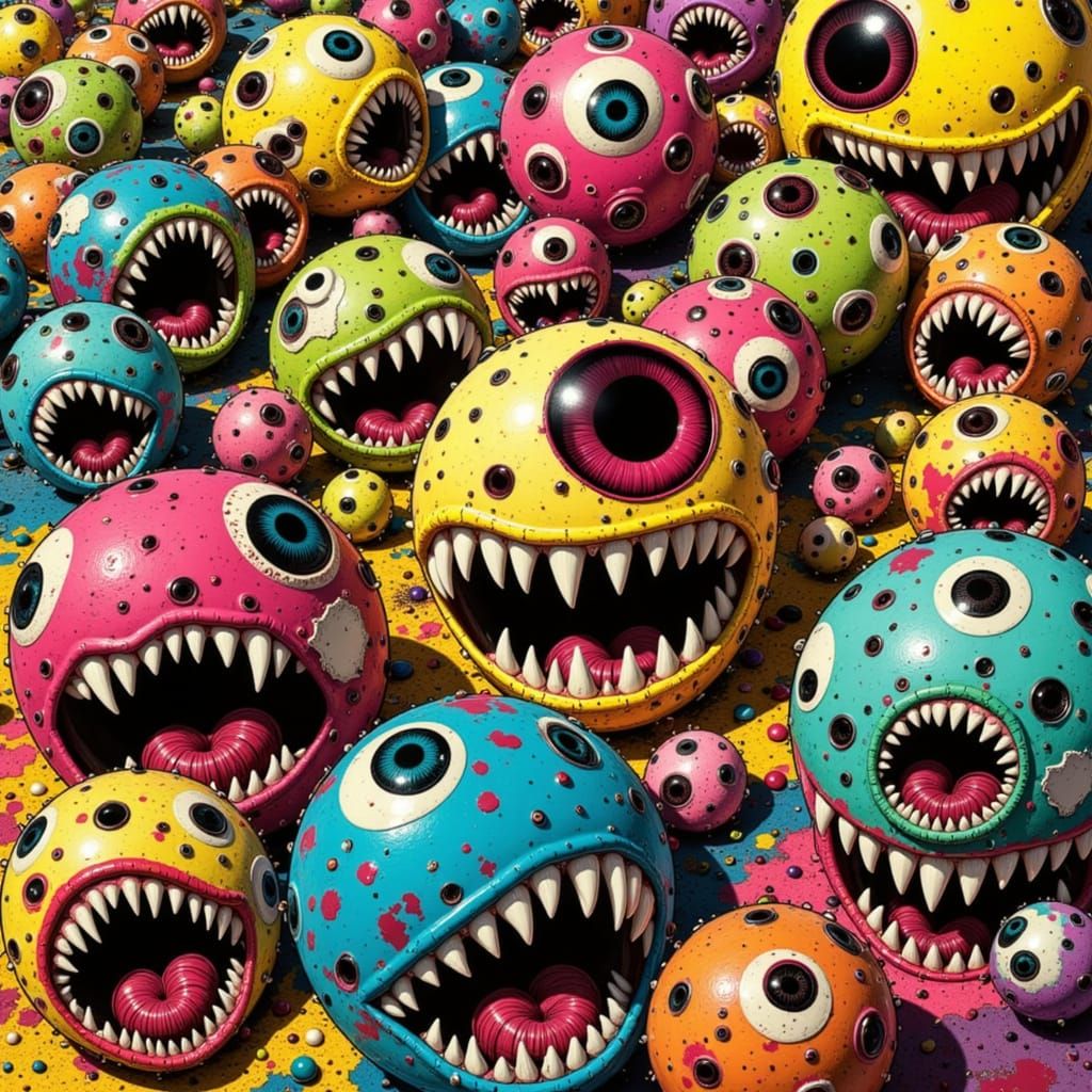 This image features scattered, carnivorous eyeballs with sharp, toothy grins on a vibrant background. Rendered in a bold pop art aesthetic with clashing colors and thick outlines, it creates a dynamic and unsettling visual.