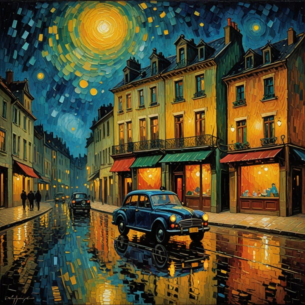 This oil painting captures a dimly lit fantasy vendor building with a parked car in front, set against a warm and moody backdrop of colourful casino lights and wet pavement. Characterized by thick, heavy brushstrokes and impasto textures, the piece combines the dreamy light of Neo-Impressionism with the ...