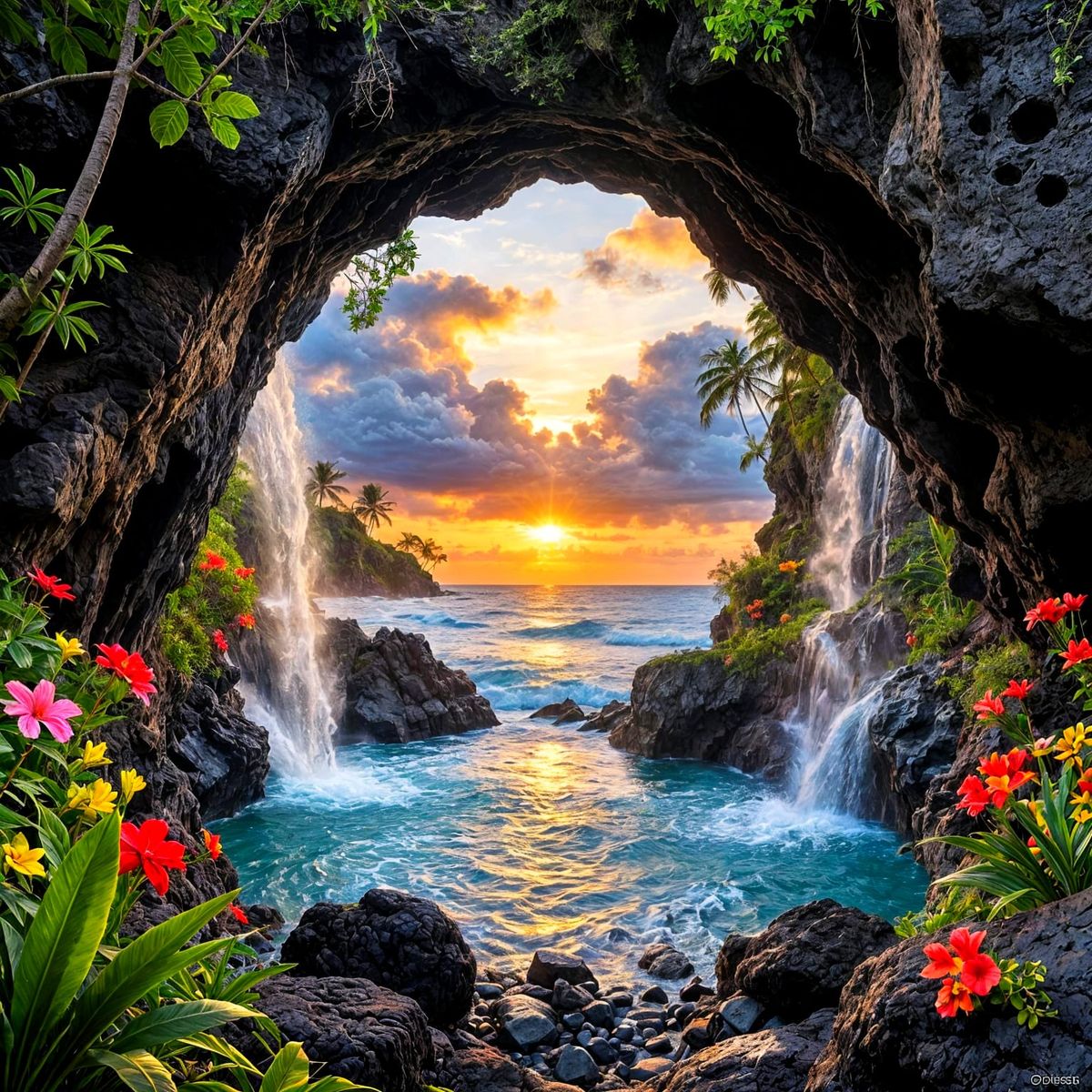 This image shows a natural volcanic rock archway leading to a tropical cove with waterfalls, illuminated by a vibrant sunset. Rendered in a detailed fantasy concept art style with dramatic lighting and luminous colors.