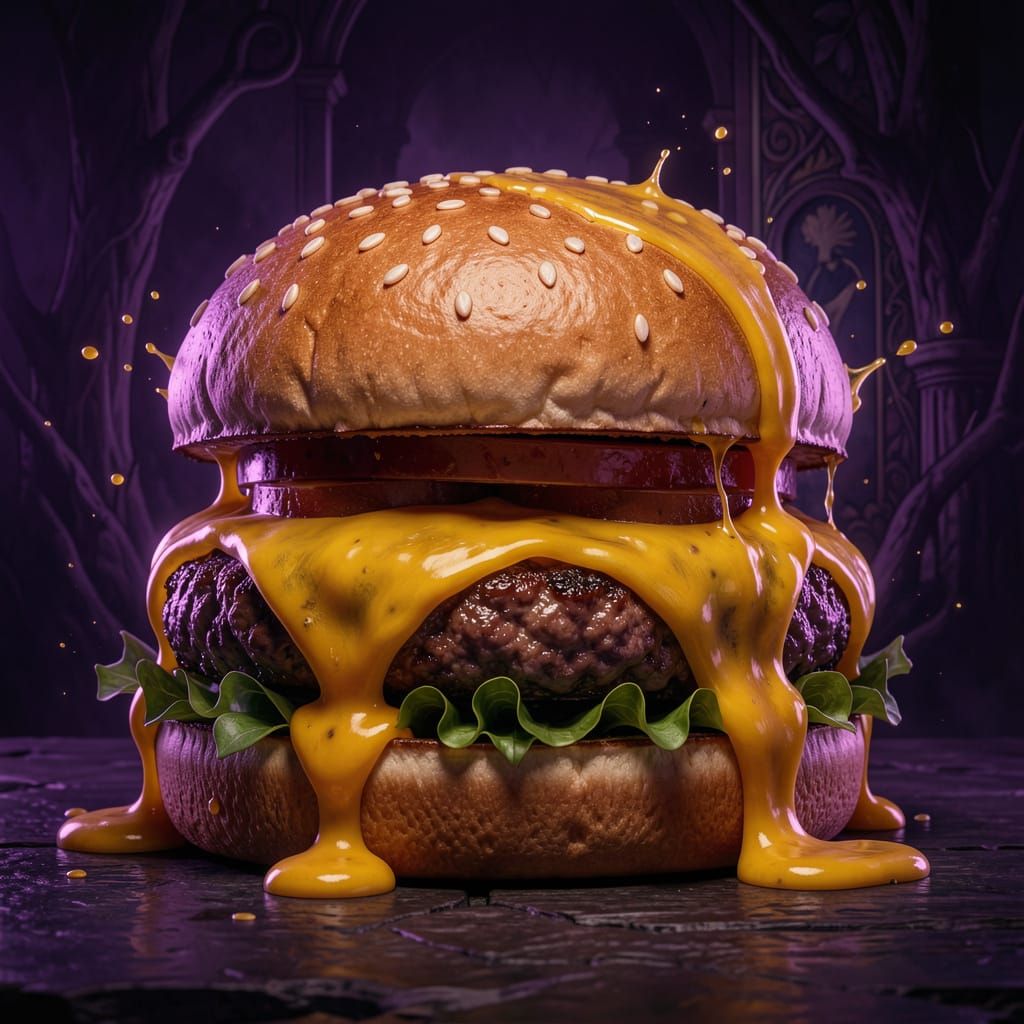 This image features a large, juicy cheeseburger with thick cheese melting down its sides. Rendered with dramatic lighting and deep complementary colors, it evokes a dark fantasy concept art aesthetic.