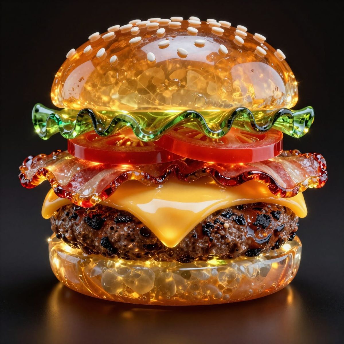 This image showcases a stunning, macro photograph of a bacon cheeseburger meticulously sculpted from glowing, translucent glass. Features dramatic studio lighting, highlighting intricate details and vibrant color refractions.
