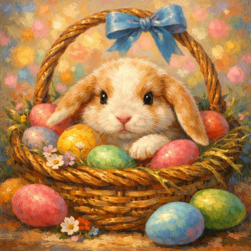 This image shows an adorable bunny peeking from a basket of Easter eggs, rendered as a detailed, vibrant oil painting with a soft pastel bokeh background.
