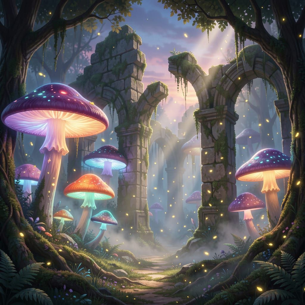 A breathtaking masterpiece set in a bioluminescent forest at twilight, where towering glowing mushrooms cast soft radiant light over ancient moss-covered ruins. Fireflies drift gently through the misty air, illuminating broken stone arches and forgotten pathways. The atmosphere feels magical and serene, with cinematic lighting, vibrant colors, and incredible detail creating a dreamlike fantasy world that looks like a true work of art.