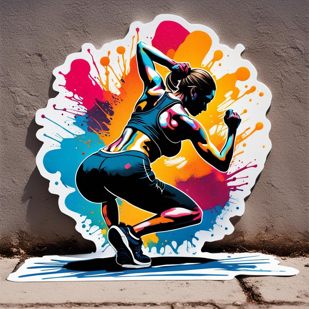 This image shows a stylized sticker design of a female silhouette in a forward bend exercise pose, set against a backdrop of graffiti art elements in a vibrant polychromatic aesthetic.