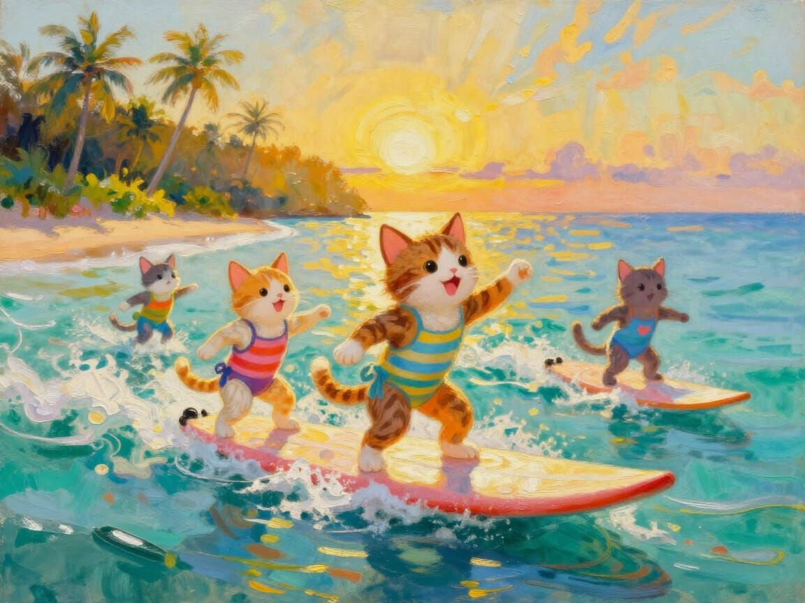 This image shows anthropomorphic cats in colorful swimwear joyfully surfing turquoise waves on a tropical island during golden hour, painted in a vibrant, impressionistic style with textured brushstrokes.