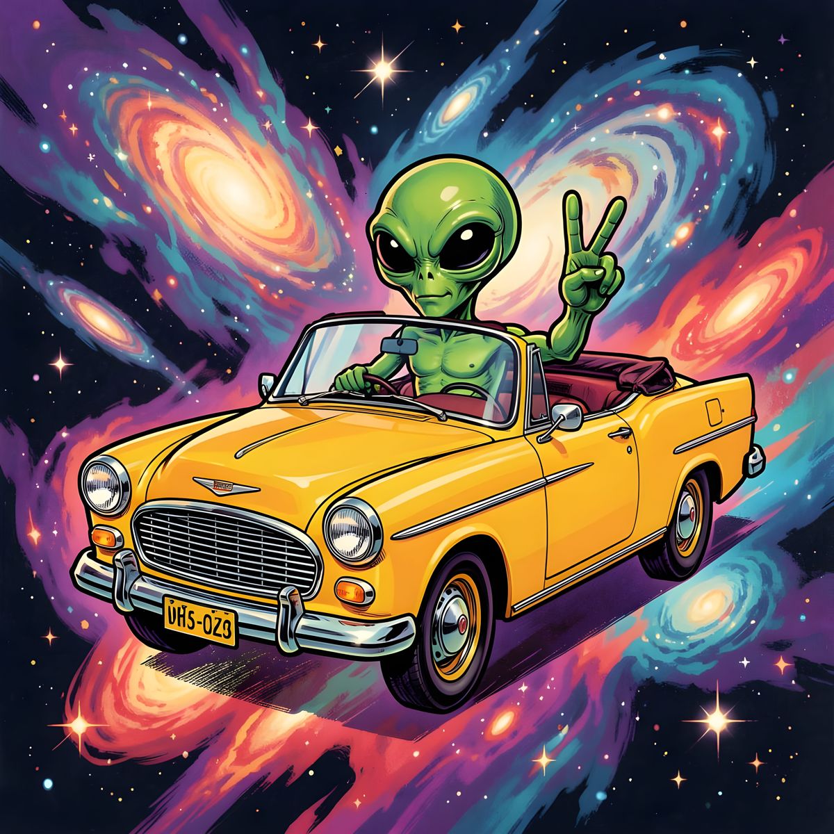 Alien sitting in car giving peace sign in outer space.